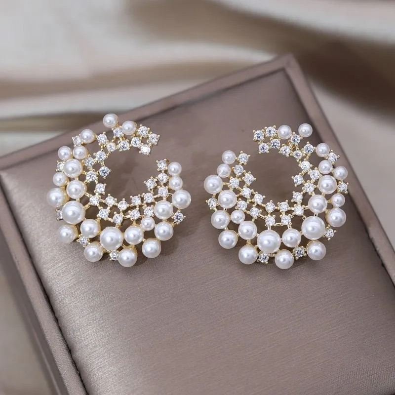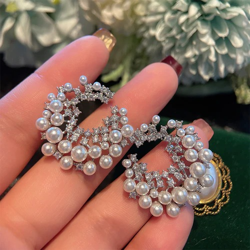 Crystal Pearl Silver Toned Circular Studs Earrings