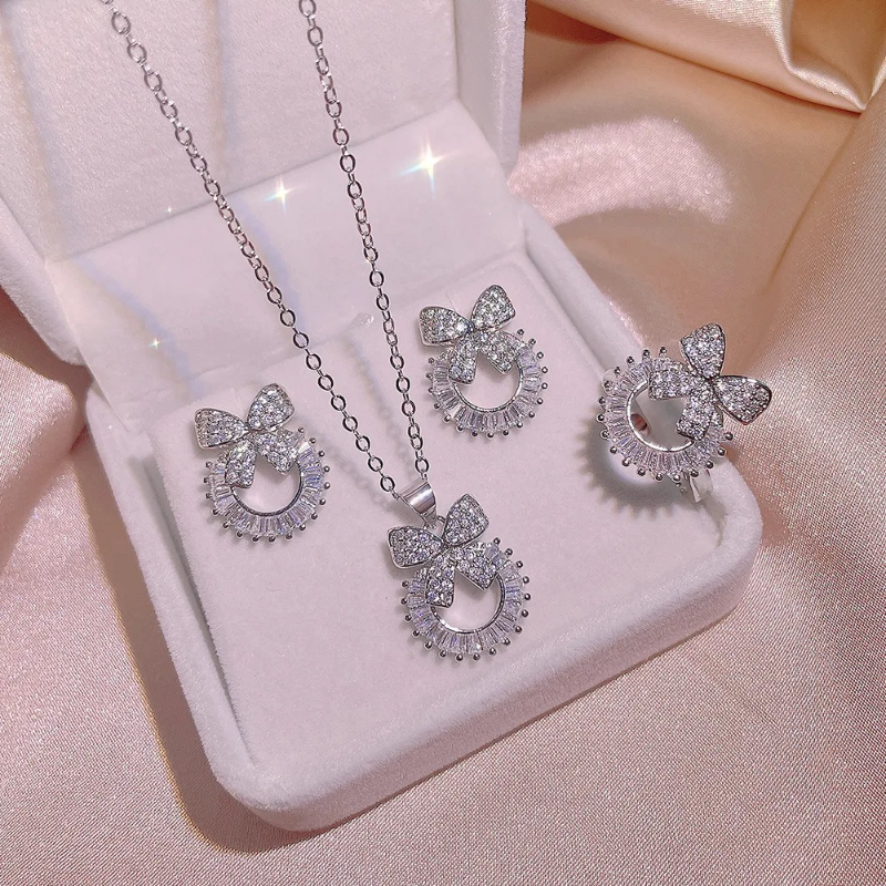 Elegant And Sweet Bow Knot Diamond Earring Necklace Ring Set