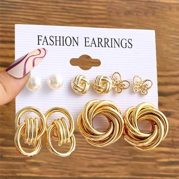 Vintage Gold Design Pearl Stud Earrings ( 6 Pairs )
