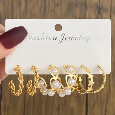 Vintage Gold Design Pearl Stud Earrings ( 6 Pairs )