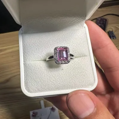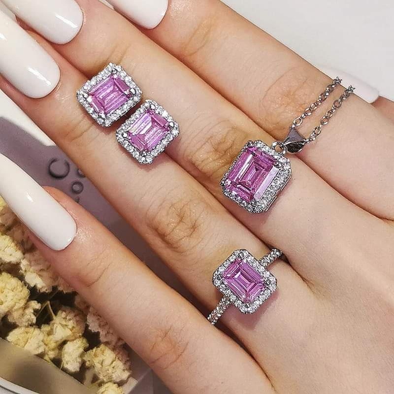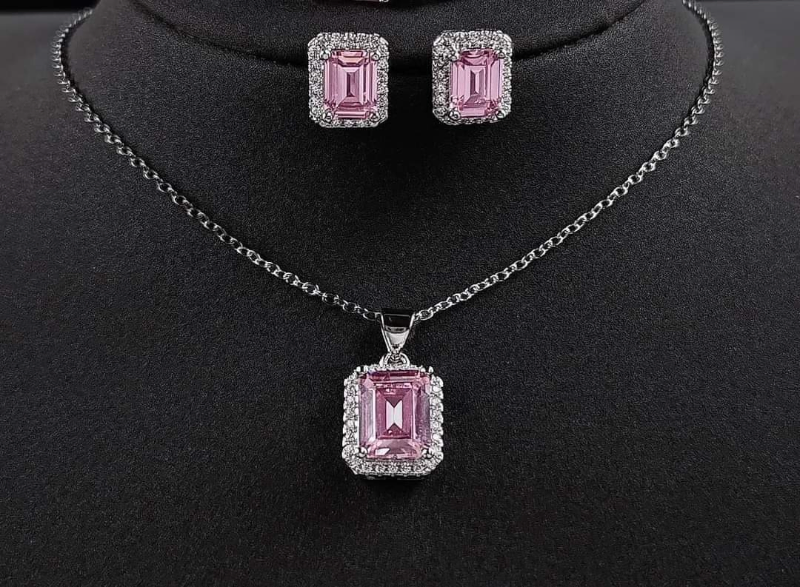 Pink Cubic Zirconia Square Pendant Necklace Set