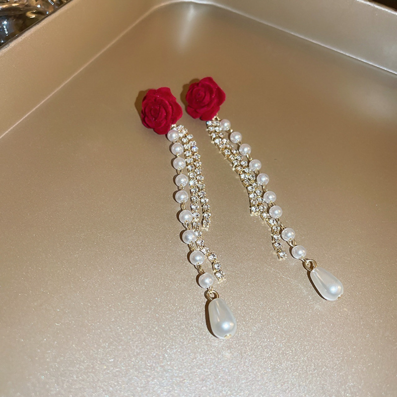 Red Rose Flower Pearl Tassel Earrings