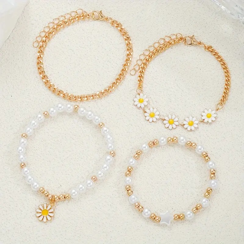 Stylish Mini Beaded & Pearl Chain Daisy Bracelets (4 pcs)