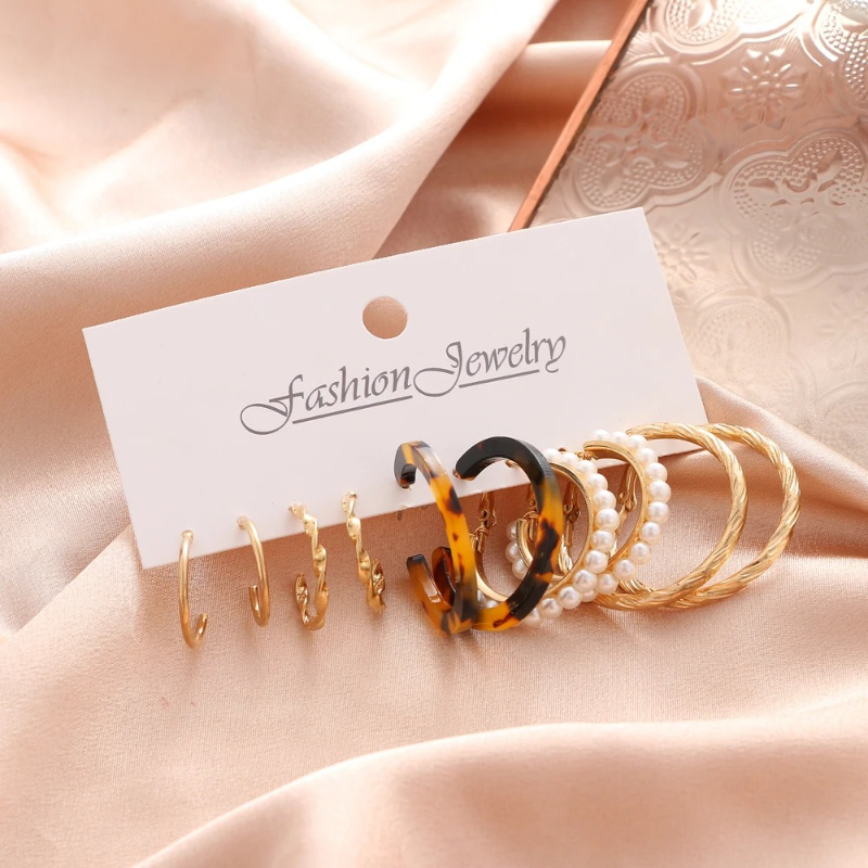 Trendy Round Shape Leopard Pearl Hoop Earrings Set (5 pairs)