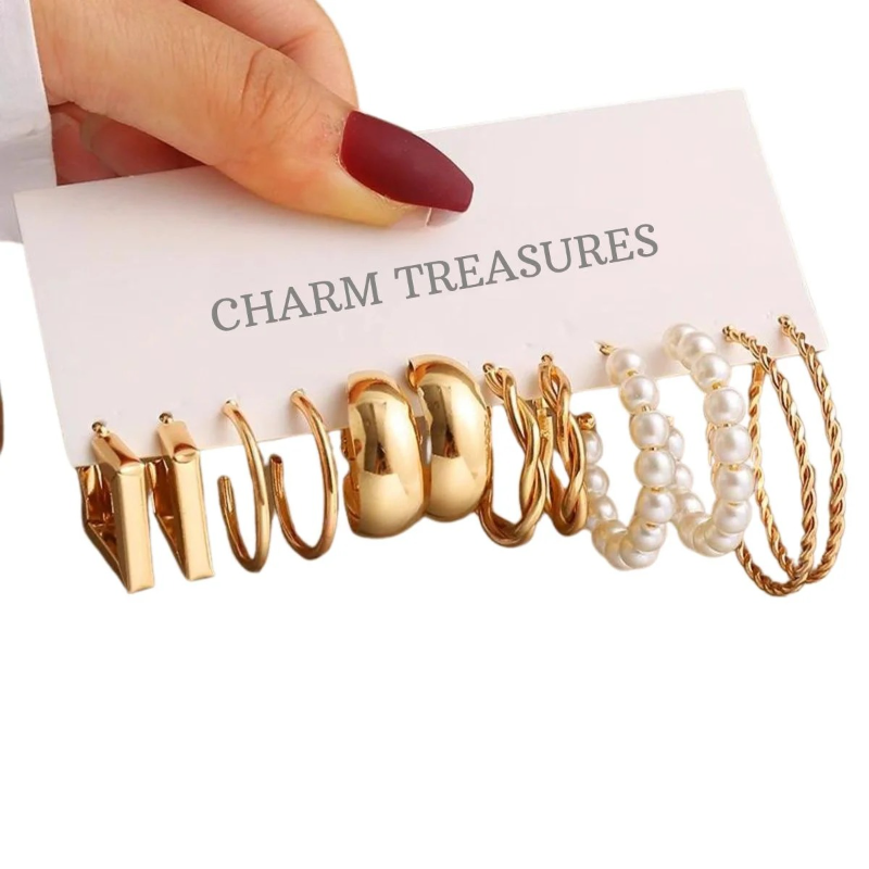 Vintage Gold Design Pearl Stud Earrings ( 6 Pairs )