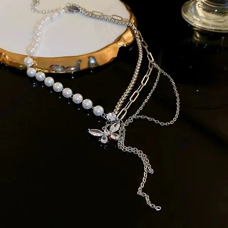 Vintage Pearl Crystal Butterfly Tassel Chain Necklac